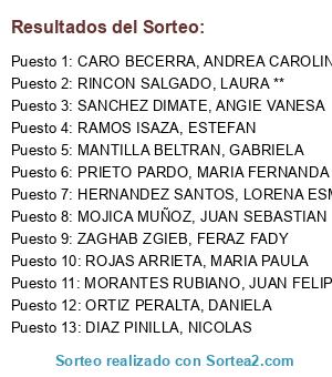 Lista de participantes: BELLO SARMIENTO, LAURA ELIZABETH, BENITEZ ACOSTA, KAREN ANDREA, CARDENAS MALAGON, CAROLINA, CARMONA AMOROCHO, GERMAN ANDRES, CARO BECERRA, ANDREA CAROLINA, CASTELLANOS FERNANDEZ, MARIANNA BEATRIZ, CEPEDA CORTES, LUZ ANGELA, CHARRY BORRERO, DAVID ALEJANDRO, CUFIÑO ZAMORA, DIANA CAROLINA, DIAZ PINILLA, NICOLAS, GARZON VIASUS, MARIA CAMILA, GOMEZ CHICRE, VANESSA ALEXANDRA, GONZALEZ GUTIERREZ, HECTOR JULIAN, GONZALEZ MOYA, DANNA LORENA, GOODING GEITHNER, CATHERINE, HERNANDEZ SANTOS, LORENA ESMERALDA, LEON ROMERO, VALERIA, LIZARAZO PARAMO, LINA PAOLA, MANTILLA BELTRAN, GABRIELA, MEDINA HERNANDEZ, JUAN CARLOS, MENDOZA ACEVEDO, WHENDY ALEJANDRA, MOJICA MUÑOZ, JUAN SEBASTIAN, MONDRAGON BRAVO, MARIA LIGIA, MORANTES RUBIANO, JUAN FELIPE, MOYA ACUÑA, DIANA MARIA, MUÑOZ MC CAUSLAND, MARIA PAULA, MUÑOZ SALCEDO, CARLOS ALBERTO, NONZOQUE , ALEJANDRA PAOLA, OROZCO MESA, SEBASTIAN, ORTIZ PERALTA, DANIELA, PACHON OLMOS, JULIANA ANDREA, PEDREROS SUAREZ, KAREN DAYANNA, PINEDA CORTES, LAURA DANIELA, PRIETO PARDO, MARIA FERNANDA, RAMIREZ OLAYA, ADRIANA MARIA, RAMOS ISAZA, ESTEFAN, RINCON SALGADO, LAURA **, ROA GONZALEZ, JULIAN MATEO, RODRIGUEZ DIAZ, AURA LUCIA, ROJAS ARRIETA, MARIA PAULA, ROJAS FAJARDO, JENNY PAOLA, ROJAS PENA, VALENTINA, ROJAS RODRIGUEZ, LUIS CARLOS, ROZO VARGAS, MARIO NICOLAS, SANCHEZ DIMATE, ANGIE VANESA, SAZA SALAS, LAURA DANIELA, SCOTTI DOVIDIO, SALVADOR ALEJANDRO, URUBURO CABEZAS, LAURA MARIA, ZAGHAB ZGIEB, FERAZ FADY, ZANNIN FERRERO, ANDREINA, ZAPATA LOVERA, LAURA FERNANDA.