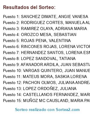 Lista de participantes: AFANADOR ARDILA, JUAN SEBASTIAN, AGUIRRE MOYANO, GABRIELLA, AIVASOVSKY TROTTA, IVAN CONSTANTINO, ALCARAZ CAÑOZARES, PAULA MARCELA, ARAMENDIZ , MANUEL FELIPE, ARAUJO TABARES, RAUL ANDRES, BALCAZAR MUNOZ, EMMA ISABEL, BARRAGAN PEDRAZA, LUIS ALFONSO, BELLO SARMIENTO, LAURA ELIZABETH, BENITEZ ACOSTA, KAREN ANDREA, BUENO LOPEZ, JORGE EDUARDO, CAICEDO DURAN, LAURA CAMILA, CARDENAS MALAGON, CAROLINA, CARMONA AMOROCHO, GERMAN ANDRES, CARO BECERRA, ANDREA CAROLINA, CASTELLANOS FERNANDEZ, MARIANNA BEATRIZ, CEPEDA CORTES, LUZ ANGELA, CHARRY BORRERO, DAVID ALEJANDRO, CUFIÑO ZAMORA, DIANA CAROLINA, DIAZ PINILLA, NICOLAS, DUARTE DE LA ESTRELLA, LAURA, FERNANDEZ CARO, DANIELA, FERRER MARCANO, AMENAIDA CAROLINA, GARZON VIASUS, MARIA CAMILA, GOMEZ CHICRE, VANESSA ALEXANDRA, GOMEZ GOMEZ, VALERIA, GONZALEZ GUTIERREZ, HECTOR JULIAN, GONZALEZ MOYA, DANNA LORENA, GONZALEZ PINTO, PAULA ANDREA, GOODING GEITHNER, CATHERINE, GORDILLO TORRES, JUAN SEBASTIAN, GUTIERREZ MONTENEGRO, LINA MARIA, HANNA RODRIGUEZ, FRANKLIN ALBERTO, HERNANDEZ ARCILA, MARIA DANIELA, HERNANDEZ SANTOS, LORENA ESMERALDA, HERRERA TAMAYO, MANUELA, HIGUERA CARRILLO, JUANITA NATHALIE, JIMENEZ MORALES, SILVIA CAMILA, LEON ROMERO, VALERIA, LIZARAZO PARAMO, LINA PAOLA, LOPEZ ORDOÑEZ, JULIANA, LOPEZ SANDOVAL, TATIANA, MATEUS MORA, SASKIA LORENA, MEDINA HERNANDEZ, JUAN CARLOS, MENDOZA ACEVEDO, WHENDY ALEJANDRA, MICHELSEN ANDRADE, MARIANA, MOJICA MUÑOZ, JUAN SEBASTIAN, MONDRAGON BRAVO, MARIA LIGIA, MORANTES RUBIANO, JUAN FELIPE, MOYA ACUÑA, DIANA MARIA, MUÑOZ MC CAUSLAND, MARIA PAULA, MUÑOZ SALCEDO, CARLOS ALBERTO, MURILLO RAMIREZ, MARIA NATALIA, NONZOQUE , ALEJANDRA PAOLA, OROZCO MESA, SEBASTIAN, ORTIZ PERALTA, DANIELA, PACHON OLMOS, JULIANA ANDREA, PALACIO GIRALDO, CATALINA, PARRA CHARRIS, ANDRES EDUARDO, PEDREROS SUAREZ, KAREN DAYANNA, PEREZ VARGAS, MARIA VALENTINA, PINEDA CORTES, LAURA DANIELA, PINEDO AGUDELO, JENNIFER ANDREA, PRIETO GUERRERO, ALEJANDRA, PRIETO PARDO, MARIA FERNANDA, PULIDO RODRIGUEZ, MELISA FERNANDA, QUINTERO MUÑOZ, DANIEL ESTEBAN, RAMIREZ OLAYA, ADRIANA MARIA, RAMIREZ RINCON, ANGELICA, RAMOS ISAZA, ESTEFAN, RINCON SALGADO, LAURA **, RINCON SUAREZ, MARIA JOSE, RINCONES ROJAS, LORENA VICTORIA, RIOS ACUÑA, STEFANY DE JESUS, ROA GONZALEZ, JULIAN MATEO, RODRIGUEZ CORTES, MANUELA ALEJANDRA, RODRIGUEZ DIAZ, AURA LUCIA, ROJAS ARRIETA, MARIA PAULA, ROJAS FAJARDO, JENNY PAOLA, ROJAS PENA, VALENTINA, ROJAS RODRIGUEZ, LUIS CARLOS, ROZO VARGAS, MARIO NICOLAS, RUEDA ULLOA, OLGA CAROLINA, SALAS DAMIANI, MERCEDES ELENA, SANCHEZ CAICEDO, MARIA JOSE, SANCHEZ DIMATE, ANGIE VANESA, SANCHEZ ESPINEL, JENNIFER DAIANNA, SANTAMARIA CASTIBLANCO, NATALIA, SAZA SALAS, LAURA DANIELA, SCOTTI DOVIDIO, SALVADOR ALEJANDRO, URUBURO CABEZAS, LAURA MARIA, VARGAS QUINTERO, JUAN MANUEL, VILLALOBOS PEREZ, JULIO ALEJANDRO, ZAGHAB ZGIEB, FERAZ FADY, ZANNIN FERRERO, ANDREINA, ZAPATA LOVERA, LAURA FERNANDA.
