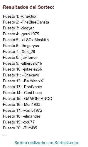 Lista de participantes: -Cast Loup, -Balthier xX, -Varox ESP, -dogyer, -Xes_28, -Borja ESP, -javiferrer, -jotaele256, -Turbi95, -thegoryss, -kinectox, -Jonathanpnk, -Killtopinocchio, -xLSDx Moskitin, -gordi1975, -Josepepu, -LAPIDADOR, -IL MURO, -TheBlueGansta, -TurnedoESP, -fervolador, -Chekevo, -GAMOBLANCO, -Mori1983, -PopiNorris, -Roscarage, -albercstd16, -vamp1972, -xou77, -a3boti, -Blastergun, -elmander.
