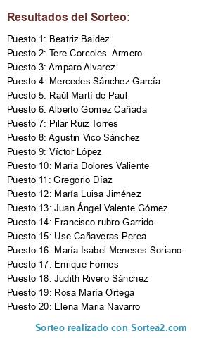 Lista de participantes: Arturo Mongrell Corral, Javi Garrigos Muñoz, José Miguel Villalba, Estefanía Chanfre, Asun Lucas Cano, Francisco rubro Garrido, Gregorio Díaz, Víctor López, Elena Maria Navarro, Nani García de León, Conchi Polo, Vanesa Rodríguez Ortega, Tere Corcoles Armero, José Ángel Baidez García, María Dolores Valiente, Juan Ángel Valente Gómez, Amparo Alvarez, Rosana Ramírez Olmedo, Judith Rivero Sánchez, Raúl Martí de Paul, Mercedes Sánchez García, Agustin Vico Sánchez, Enrique Fornes, Jesús Pérez Pedrero, Pilar Ruiz Torres, María Luisa Jiménez, Rosa María Ortega, José María González, Antonio Pérez Plasencia, María Isabel Meneses Soriano, Alberto Gomez Cañada, Pascual González Luján, Jose Ignacio Marcellán, Isaba Serrano Castellanos, Araceli Serrano Castellanos, Juan Zapatilla, Beatriz Baidez, Laura Molina Maestro, Francisco Martínez Auñón, Use Cañaveras Perea, Tere Picazo Morales.