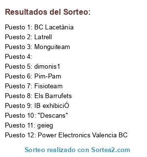 Lista de participantes: BC Lacetània, geieg, Fisioteam, "Descans", Monguiteam, IB exhibiciÓ, Els Barrufets, Power Electronics Valencia BC, Durex Rubí, Pim-Pam, Latrell, dimonis1, .