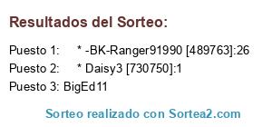 Lista de participantes: * Daisy3 [730750]:1, * -BK-Ranger91990 [489763]:16, * -BK-Ranger91990 [489763]:17, * -BK-Ranger91990 [489763]:1, * -BK-Ranger91990 [489763]:18, * -BK-Ranger91990 [489763]:19, * -BK-Ranger91990 [489763]:20, * -BK-Ranger91990 [489763]:21, * -BK-Ranger91990 [489763]:22, * -BK-Ranger91990 [489763]:23, * -BK-Ranger91990 [489763]:24, * -BK-Ranger91990 [489763]:9, * -BK-Ranger91990 [489763]:25, * -BK-Ranger91990 [489763]:26, BigEd1, * -BK-Ranger91990 [489763]:2, BigEd2, BigEd3, BigEd4, BigEd5, BigEd6, BigEd7, * -BK-Ranger91990 [489763]:10, BigEd8, BigEd9, BigEd10, BigEd11, * -BK-Ranger91990 [489763]:3, BigEd12, BigEd13, * -BK-Ranger91990 [489763]:4, * -BK-Ranger91990 [489763]:5, * -BK-Ranger91990 [489763]:6, * GypsyTears [1288842]:1, * -BK-Ranger91990 [489763]:7, * -BK-Ranger91990 [489763]:8, * -BK-Ranger91990 [489763]:11, * -BK-Ranger91990 [489763]:12, * -BK-Ranger91990 [489763]:13, * -BK-Ranger91990 [489763]:14, * -BK-Ranger91990 [489763]:15.