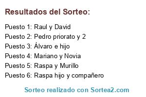 Lista de participantes: Raul y David, Álvaro e hijo, Raspa y Murillo, Mariano y Novia, Raspa hijo y compañero, Pedro priorato y 2.