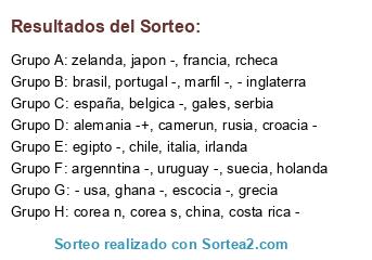 Lista de participantes: marfil -, china, portugal -, españa, escocia -, corea n, alemania -+, camerun, egipto -, italia, croacia -, rusia, uruguay -, corea s, ghana -, chile, argenntina -, serbia, japon -, rcheca, grecia, - usa, gales, - inglaterra, belgica -, francia, costa rica -, suecia, zelanda, brasil, holanda, irlanda.