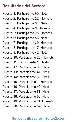 Lista de participantes: Participante 1: Hornets, Participante 2: Hornets, Participante 3: Hornets, Participante 4: Hornets, Participante 5: Hornets, Participante 6: Hornets, Participante 7: Hornets, Participante 8: Hornets, Participante 9: Hornets, Participante 10: Hornets, Participante 11: Hornets, Participante 12: Hornets, Participante 13: Hornets, Participante 14: Hornets, Participante 15: Hornets, Participante 16: Hornets, Participante 17: Hornets, Participante 18: Hornets, Participante 19: Hornets, Participante 20: Hornets, Participante 21: Hornets, Participante 22: Hornets, Participante 23: Hornets, Participante 24: Hornets, Participante 25: Hornets, Participante 26: Hornets, Participante 27: Hornets, Participante 28: Hornets, Participante 29: Hornets, Participante 30: Hornets, Participante 31: Nets, Participante 32: Nets, Participante 33: Nets, Participante 34: Nets, Participante 35: Nets, Participante 36: Nets, Participante 37: Nets, Participante 38: Nets, Participante 39: Nets, Participante 40: Nets, Participante 41: Nets, Participante 42: Nets, Participante 43: Nets, Participante 44: Nets, Participante 45: Nets, Participante 46: Nets, Participante 47: Nets, Participante 48: Nets, Participante 49: Nets, Participante 50: Nets, Participante 51: Nets, Participante 52: Nets, Participante 53: Nets, Participante 54: Nets, Participante 55: Nets, Participante 56: Nets, Participante 57: Nets, Participante 58: Nets, Participante 59: Nets, Participante 60: Nets, Participante 61: Nets, Participante 62: Nets, Participante 63: Nets, Participante 64: Nets, Participante 65: Nets.