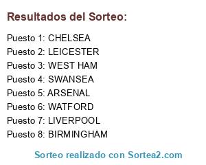 Lista de participantes: CHELSEA, ARSENAL, BIRMINGHAM, WATFORD, LEICESTER, LIVERPOOL, SWANSEA, WEST HAM.