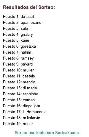 Lista de participantes: neuer, castels, pavard, hakimi, mendy, sule, upamecano, L.Hernandez, ramsey, de paul, goretzka, gnabry, di maria, milinkovic, muller, diogo jota, coman, raphinha, kane.