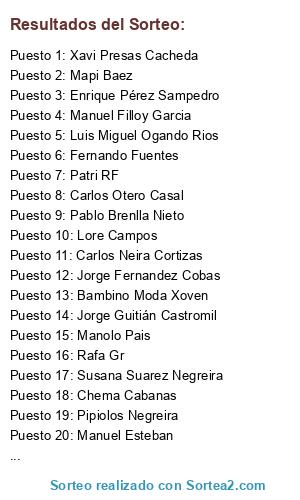 Lista de participantes: Pilar M. Montero Caamaño, Diego Suevos, Lolo Gil Calviño, Carlos Otero Casal, Elvis Rodriguez Fernandez, Bambino Moda Xoven, Noemí Sánchez, Enrique Pérez Sampedro, Susana Suarez Negreira, Jorge Fernandez Cobas, Ruben Romero Caamaño, Marta Yatiqueteimporta, Sil Couto, Sandra Varela Amado, Barbara Mansilla Barreiro, Alex Sieira Argibay, Graciela Dipasquale, Mapi Baez, Merche Francisco Fuentes, Pipiolos Negreira, Rafa Gr, Lore Campos, Manuel Esteban, Sara Gonzalez Suarez, Irene Cambeiro Lago, Loly Llano, Luis Miguel Ogando Rios, Chema Cabanas, Maria Folgar Martinez, Manuel Filloy Garcia, Fatima Piñeiro Folgar, Xavi Presas Cacheda, Jose Crusat Gonzalez, Carlos Neira Cortizas, Álvaro Silva Suárez, Raquel Veira Díaz, Jorge Guitián Castromil, Leticia T. Blanco, Manolo Pais, Patri RF, Pablo Brenlla Nieto, Fernando Fuentes, Rubén Santamaría Rama, .