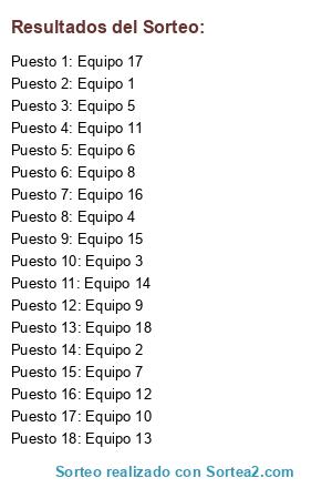 Lista de participantes: Equipo 1, Equipo 2, Equipo 3, Equipo 4, Equipo 5, Equipo 6, Equipo 7, Equipo 8, Equipo 9, Equipo 10, Equipo 11, Equipo 12, Equipo 13, Equipo 14, Equipo 15, Equipo 16, Equipo 17, Equipo 18.