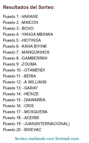 Lista de participantes: -JUAN(INTERNACIONAL), -GAMBERRINI, -BISEVAC, -MOSQUERA, -CRIS, -MARQUINHOS, -KANA BIYINK, -DIAWARRA, -ZOUMA, -YANGA MBINWA, -VARANE, -BERIA, -HEINZE, -A.WILLIANS, -ACERBI, -GARAY, -MAICON, -OTAMENDI, -BOVO, -HEITINGA.