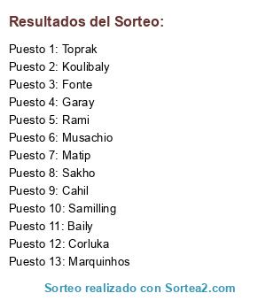 Lista de participantes: Koulibaly, Musachio, Garay, Toprak, Fonte, Samilling, Baily, Matip, Cahil, Rami, Corluka, Marquinhos, Sakho.