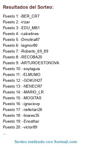 Lista de participantes: -lagmor80, -INSKI77, -linares35, -EDU_MB1, -irizar, -ralalarcn, -ignaciovp, -Enosthar, -aandia, -NENECR7, -nefertari26, -EHB_KIKE, -RECOBA20, -soylaguia, -ELMUMO, -ELOSKARON, -GURRIPULLI, -MOGITAS, -ZER11, -ARTUROESTONOVA, -reywwf619, -franciskiko_8, -BER_CR7, -GOKUH27, -Roberto_69_89, -Achachancha2, -calcetines, -Dmolina87, -victor89, -MARIO_LR.