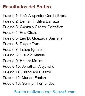 Lista de participantes: Felipe Ignacio, Matías Fabián, Jonathan Alejandro, Pes Chalo, Hector Matias, Germán Fernández, Gonzalo Castro González, Raigor Toro, Raúl Alejandro Cerda Rivera, Leo D. Quezada Santana, Francisco Pizarro, Benjamin Silva Barraza, Claudio Matías.