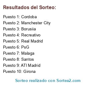 Lista de participantes: Girona, Real Madrid, Santos, Cordoba, PsG, Malaga, ATl Madrid, Manchester City, Borusiia, Recreativo.