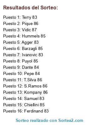 Lista de participantes: Vidic 87, S.Ramos 86, T.Silva 86, Kompany 86, Pique 86, Hummels 85, Puyol 85, Chiellini 85, Barzagli 85, Dante 84, Pepe 84, Terry 83, Ferdinand 83, Ivanovic 83, Samuel 83, Agger 83.