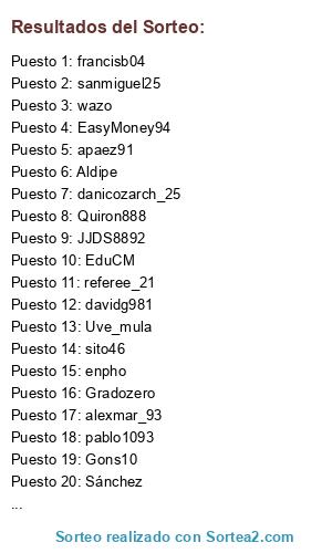 Lista de participantes: Aldipe, Adri_casti90, Josedvd89, ai-man-lol, enpho, Joryserso, pablo1093, Midaniel3, Danimese, Quiron888, Gons10, francisb04, fornides, apaez91, wazo, referee_21, pedroeloy95, danicozarch_25, mangel.sl, EduCM, Chemita1993, Orbi11, leticoes, JJDS8892, angei88, sito46, davidg981, alexmar_93, ellocuhd, JonanPB8, Uve_mula, sanmiguel25, Franciskiyo, EasyMoney94, Lokikolirota, pombokiller, jaimegx_94, Gradozero, Sánchez, Alberto9.