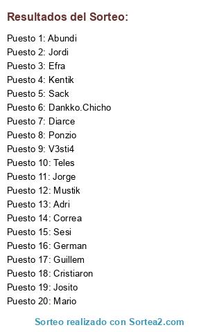 Lista de participantes: 1.-d4v1d_f3nix/R.Betis, 2.-ESMORIS1984/Sevilla FC, 3.-pipo/Barcelona, 4.-sendeta/Real Madrid, 5.-tuti/Manchester city, 6.-bytorres/Roma, 7.-kojho/Marsella, 8.-Nachinishev/At.Madrid, 9.-JAVINHO95STYLE/AC Milan, 10.-adriancar/Manchester UTD, 11.-ZeQuI/Inter Milan, 12.-adrii_pablo/Chelsea, 13.-alicate9/Bayern Munich, 14.-flekis/Napoles, 15.-landergarcia/Juventus, 16.-serer9/Arsenal, 17.-Ikergol/Tottenham, 18.-jonminas2/Liverpool.