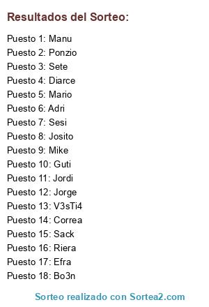 Lista de participantes: Efra, V3sTi4, Correa, Jordi, Mike, Diarce, Josito, Manu, Riera, Ponzio, Adri, Sesi, Mario, Guti, Sack, Jorge, Sete, Bo3n.