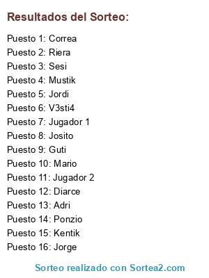 Lista de participantes: V3sti4, Guti, Ponzio, Sesi, Mario, Adri, Kentik, Jordi, Jorge, Riera, Mustik, Jugador 1, Josito, Correa, Diarce, Jugador 2.