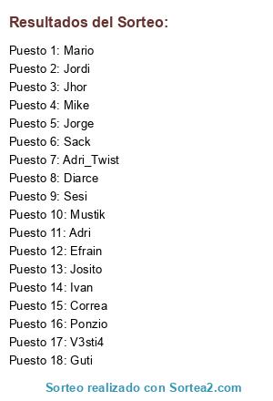 Lista de participantes: Guti, Jorge, Diarce, Ivan, Josito, Adri_Twist, Efrain, Adri, Sesi, Sack, V3sti4, Mustik, Mario, Jhor, Ponzio, Correa, Mike, Jordi.