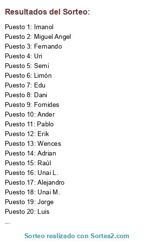 Lista de participantes: Fernando, Unai M., Alejandro, Erik, Wences, Adrian, Jorge, Imanol, Enpho, Limón, Ander, Unai L., Jose David, Raúl, Pablo, Uri, Edu, Luis, Miguel Angel, Fornides, Semi, Dani.