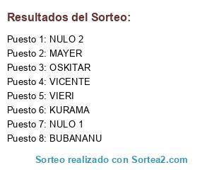 Lista de participantes: BUBANANU, KURAMA, MAYER, VICENTE, OSKITAR, VIERI, NULO 1, NULO 2.