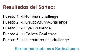 Lista de participantes: - 48 horas challenge, - Jumbo Challenge, - Años en guindilla challenge, - Eye Challenge, - ChubbyBunnyChallenge, - Intentar no reir challenge, - Galleta Challenge, - Adivina la canción challenge , - Condon Challenge, - Pistolas de agua challenge, .