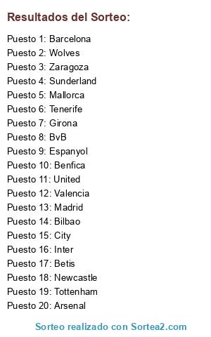 Lista de participantes: Tottenham, Bilbao, Betis, Sunderland, Benfica, Zaragoza, Mallorca, City, Espanyol, United, Madrid, Tenerife, Valencia, BvB, Wolves, Girona, Inter, Newcastle, Barcelona, Arsenal.