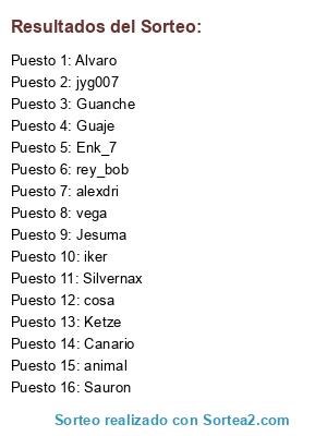Lista de participantes: Canario, Silvernax, Jesuma, Sauron, Guaje, Alvaro, Enk_7, Ketze, cosa, animal, alexdri, iker, vega, rey_bob, Guanche, jyg007.