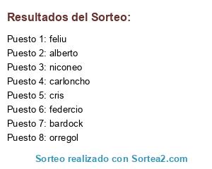Lista de participantes: orregol, federcio, bardock, carloncho, feliu, niconeo, cris, alberto.