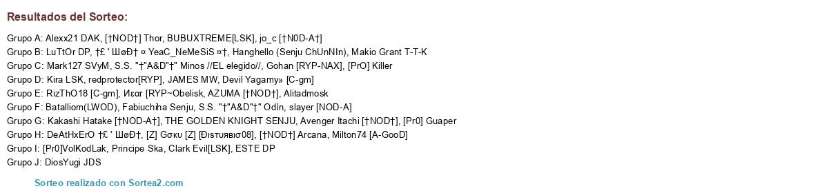 Lista de participantes: Principe Ska, Kakashi Hatake [†NOD-A†], DeAtHxErO †£ ' ШøĐ†, †£ ' ШøĐ† ¤ YeaC_NeMeSiS ¤†, Kira LSK, Hanghello (Senju ChUnNIn), Avenger Itachi [†NOD†], [PrO] Killer, AZUMA [†NOD†], S.S. "†"A&D"†" Odín, Milton74 [A-GooD], S.S. "†"A&D"†" Minos //EL elegido//, DiosYugi JDS, Makio Grant T-T-K, Fabiuchiha Senju, Mark127 SVyM, ESTE DP, Gohan [RYP-NAX], THE GOLDEN KNIGHT SENJU, RizThO18 [C-gm], slayer [NOD-A], [†NOD†] Arcana, LuTtOr DP, [Z] Gσкυ [Z] [Ðιѕтυявισ08], redprotector[RYP], Batalliom(LWOD), Devil Yagamy» [C-gm], [Pr0] Guaper, Clark Evil[LSK], BUBUXTREME[LSK], Alitadmosk, [Pr0]VolKodLak, [†NOD†] Thor, Иεαr [RYP~Obelisk, jo_c [†N0D-A†], Alexx21 DAK, JAMES MW.