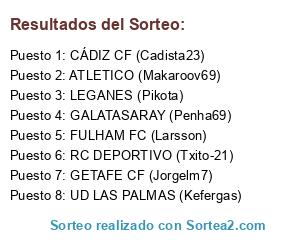 Lista de participantes: CÁDIZ CF (Cadista23), ATLETICO (Makaroov69), UD LAS PALMAS (Kefergas), RC DEPORTIVO (Txito-21), GALATASARAY (Penha69), FULHAM FC (Larsson), LEGANES (Pikota), GETAFE CF (Jorgelm7).