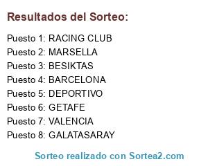 Lista de participantes: BARCELONA, DEPORTIVO, BESIKTAS, RACING CLUB, GETAFE, GALATASARAY, MARSELLA, VALENCIA.