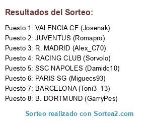 Lista de participantes: B. DORTMUND (GarryPes), RACING CLUB (Sorvolo), PARIS SG (Miguecs93), SSC NAPOLES (Damidc10), JUVENTUS (Romapro), R. MADRID (Alex_C70), VALENCIA CF (Josenak), BARCELONA (Toni3_13).