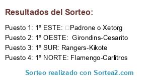 Lista de participantes: 1º NORTE: Flamengo-Carlitros, 1º ESTE: Padrone o Xetorg, 1º SUR: Rangers-Kikote, 1º OESTE: Girondins-Cesarito.