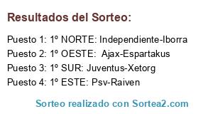 Lista de participantes: 1º NORTE: Independiente-Iborra, 1º ESTE: Psv-Raiven, 1º SUR: Juventus-Xetorg, 1º OESTE: Ajax-Espartakus.