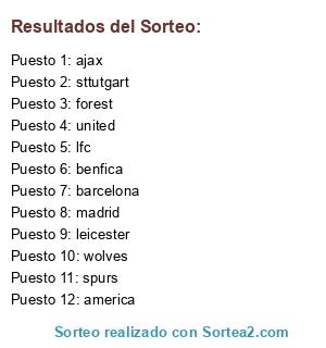 Lista de participantes: forest, madrid, america, barcelona, spurs, leicester, lfc, sttutgart, wolves, united, ajax, benfica.