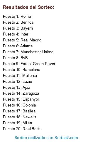 Lista de participantes: Real Madrid, Ajax, Colonia, BvB, Benfica, Inter, Newells, Roma, Lazio, Atlanta, Mallorca, Bayern, Basilea, Zaragoza, Barcelona, Espanyol, Real Betis, Forest Green Rover, Milan, Manchester United.