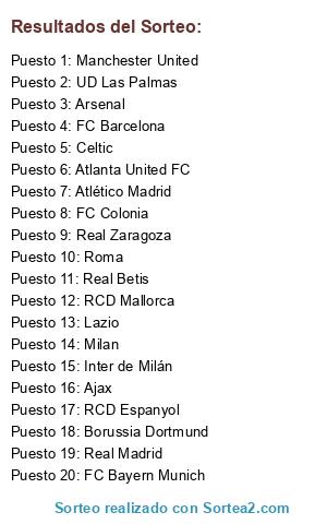 Lista de participantes: Inter de Milán, FC Colonia, Real Madrid, Borussia Dortmund, Lazio, Ajax, Roma, Atlanta United FC, FC Barcelona, Manchester United, Milan, RCD Espanyol, Atlético Madrid, Celtic, UD Las Palmas, Real Betis, FC Bayern Munich, RCD Mallorca, Real Zaragoza, Arsenal.