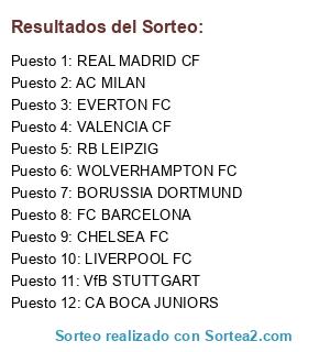 Lista de participantes: VfB STUTTGART, AC MILAN, CA BOCA JUNIORS, REAL MADRID CF, BORUSSIA DORTMUND, VALENCIA CF, RB LEIPZIG, WOLVERHAMPTON FC, FC BARCELONA, LIVERPOOL FC, EVERTON FC, CHELSEA FC.