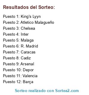 Lista de participantes: Chelsea, Valencia, Arsenal, R. Madrid, Barça, Cadiz, King's Lyyn, Inter, Caracas, Malaga, Atletico Malagueño, Depor.