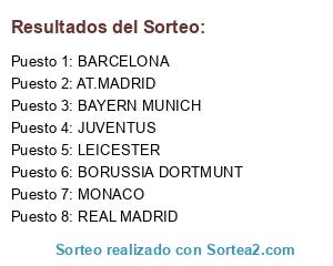 Lista de participantes: BARCELONA, REAL MADRID, BAYERN MUNICH, BORUSSIA DORTMUNT, AT.MADRID, JUVENTUS, LEICESTER, MONACO.