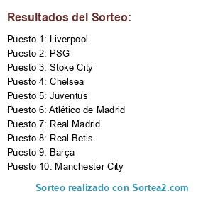 Lista de participantes: Stoke City, Liverpool, PSG, Real Betis, Real Madrid, Atlético de Madrid, Juventus, Chelsea, Barça, Manchester City.