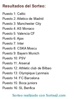 Lista de participantes: Valencia CF, FC Barcelona, AS Monaco, SL Benfica, Manchester City, Olympique Lyonnais, Celtic, Ajax, Bayern Munich, Arsenal, PSV, Athletic club de Bilbao, Atletico de Madrid, CSKA Moscu, Boca juniors, Inter.
