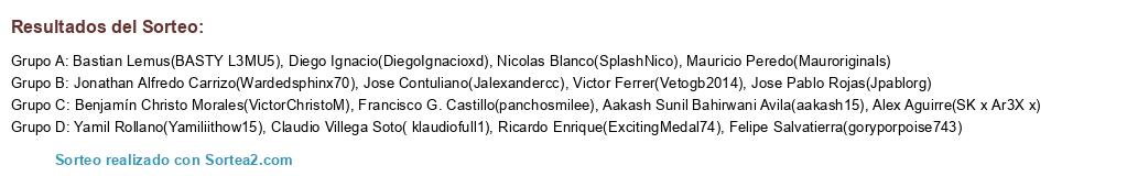 Lista de participantes: Aakash Sunil Bahirwani Avila(aakash15), Alex Aguirre(SK x Ar3X x), Bastian Lemus(BASTY L3MU5), Benjamín Christo Morales(VictorChristoM), Claudio Villega Soto( klaudiofull1), Diego Ignacio(DiegoIgnacioxd), Felipe Salvatierra(goryporpoise743), Francisco G. Castillo(panchosmilee), Jonathan Alfredo Carrizo(Wardedsphinx70), Jose Contuliano(Jalexandercc), Jose Pablo Rojas(Jpablorg), Mauricio Peredo(Mauroriginals), Nicolas Blanco(SplashNico), Ricardo Enrique(ExcitingMedal74), Victor Ferrer(Vetogb2014), Yamil Rollano(Yamiliithow15).