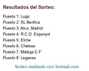 Lista de participantes: Málaga C.F, SL Benfica, Leganes, Lugo, Chelsea, Elche, R.C.D. Espanyol, Atco. Madrid.