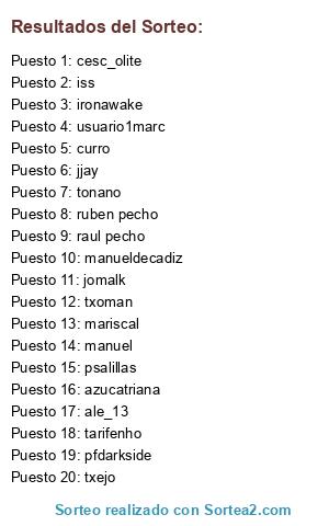 Lista de participantes: azucatriana, tonano, mariscal, cesc_olite, iss, curro, jjay, ale_13, usuario1marc, txoman, txejo, pfdarkside, ironawake, psalillas, jomalk, manuel, manueldecadiz, tarifenho, raul pecho, ruben pecho.