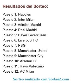 Lista de participantes: Rayo Vallecano, Atletico Madrid, Real Madrid, Inter Milan, Bayer Leverkusen, Liverpool FC, Manchester City, Manchester United, Arsenal FC, PSG, Napoles, AC Milan.