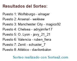 Lista de participantes: Manchester City - magico92, Chelsea - adryjimfer17, Arsenal - wekkew, Atlético - davilonbalon, Wolfsburgo - elnager, Zenit - schuster_7, Valencia - ruben_fiera, O. Lyon - javy_21_21.