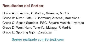 Lista de participantes: R.Madrid, Valencia, Arsenal, Liverpool, Zaragoza, River Plate, PSG, West Ham, B.Dortmund, Barcelona, Bayern Munich, Tenerife, Malaga, Juventus, At.Madrid, M.City, Seatle Sunders, Sporting Gijón.